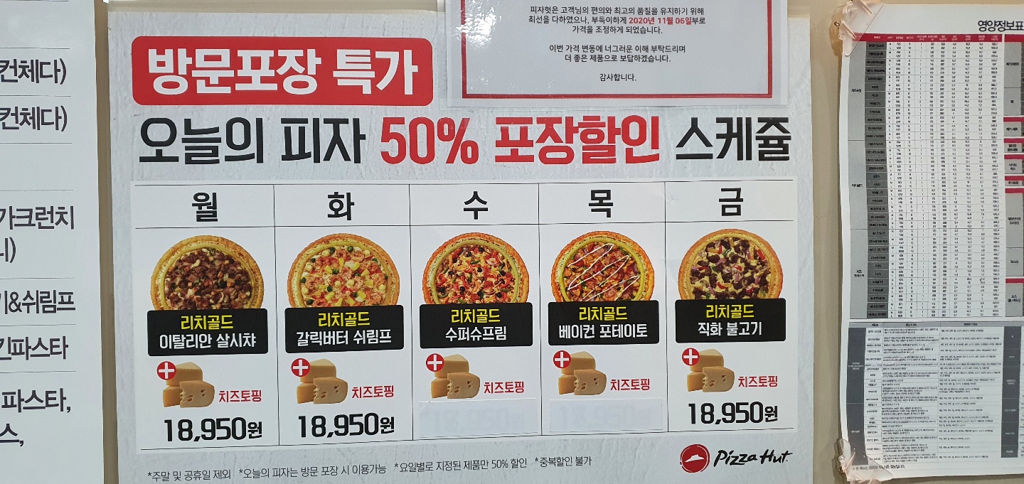그리고 오늘의 피자라고해서 방문포장 특가도 이렇게 요일별로 나와있더라고요 ㅋㅋㅋ